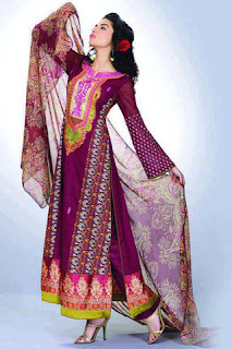 This Sana and Samia Magnifique collection 2013 has beautiful floral and block designs imprinted on borders, sleeves and necklines with aim to welcome upcoming season of spring with great fervor. Each of this latest dress range of Sana & Samia – Magnifique by Lala Textiles consists of 4 piece suits. The shirts are of long to medium length shirts, A-line shirts, frocks, shalwar kameez and some paired with churidar pajamas. The fabric used is Chiffon and Cotton which are made vintage with kaleidoscopic thread work.
